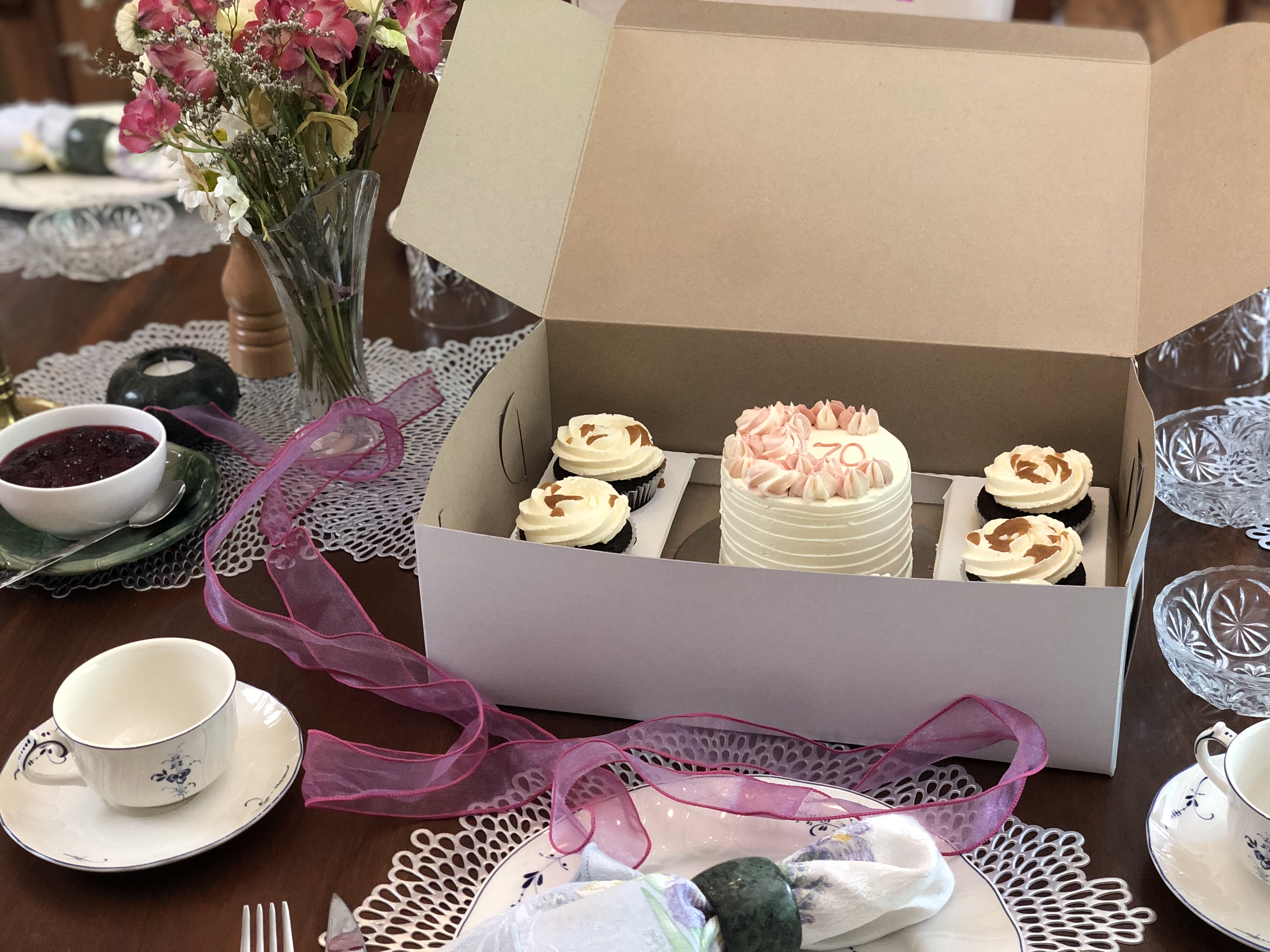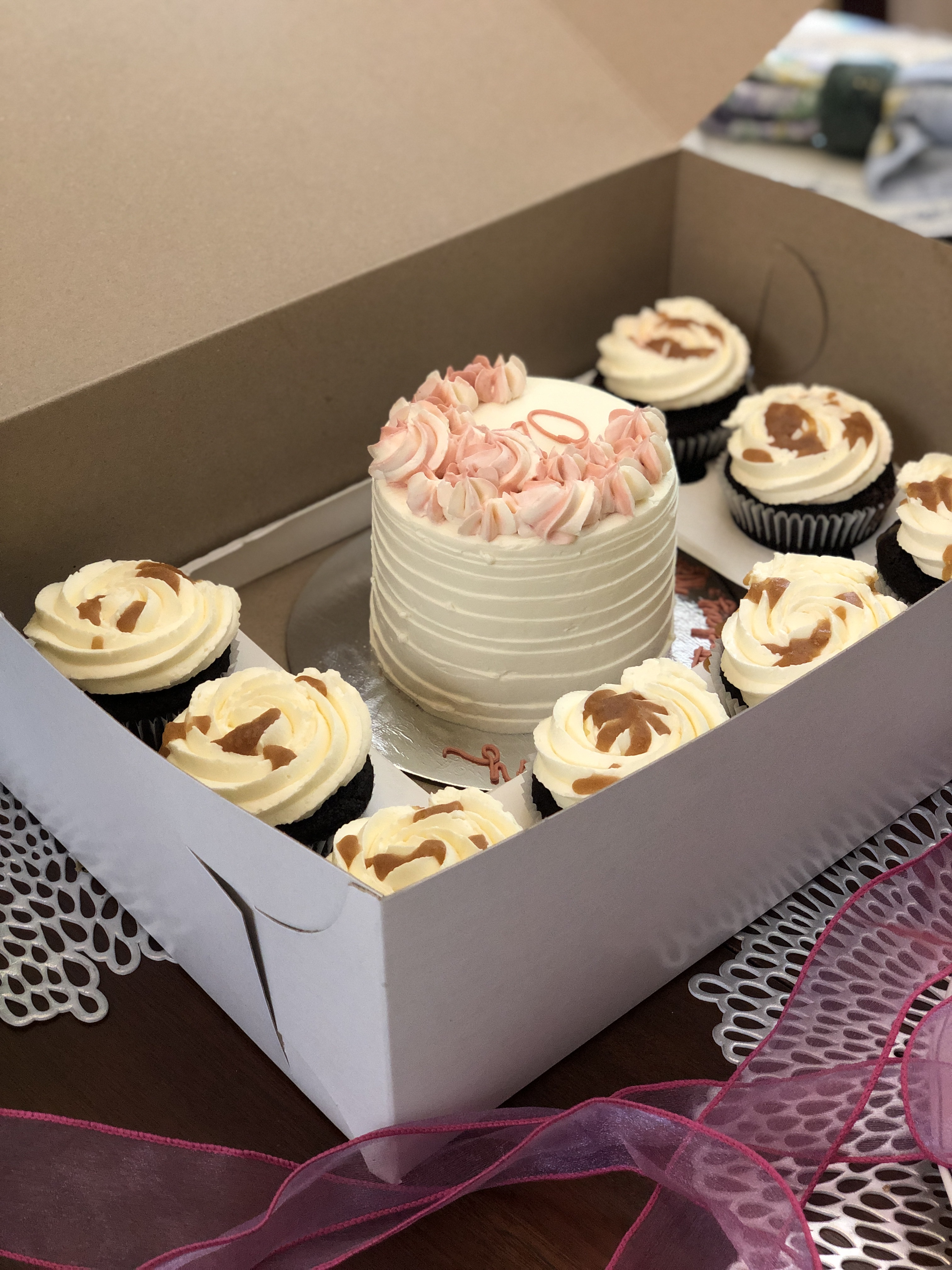 We currently have four options for non-tiered, smaller cakes for your special occasion needs: 6″ Mini Cakes, Heart Cakes, our Mini Party in a Box (4″ cake + 8 cupcakes), and our Cake Tasting Boxes.